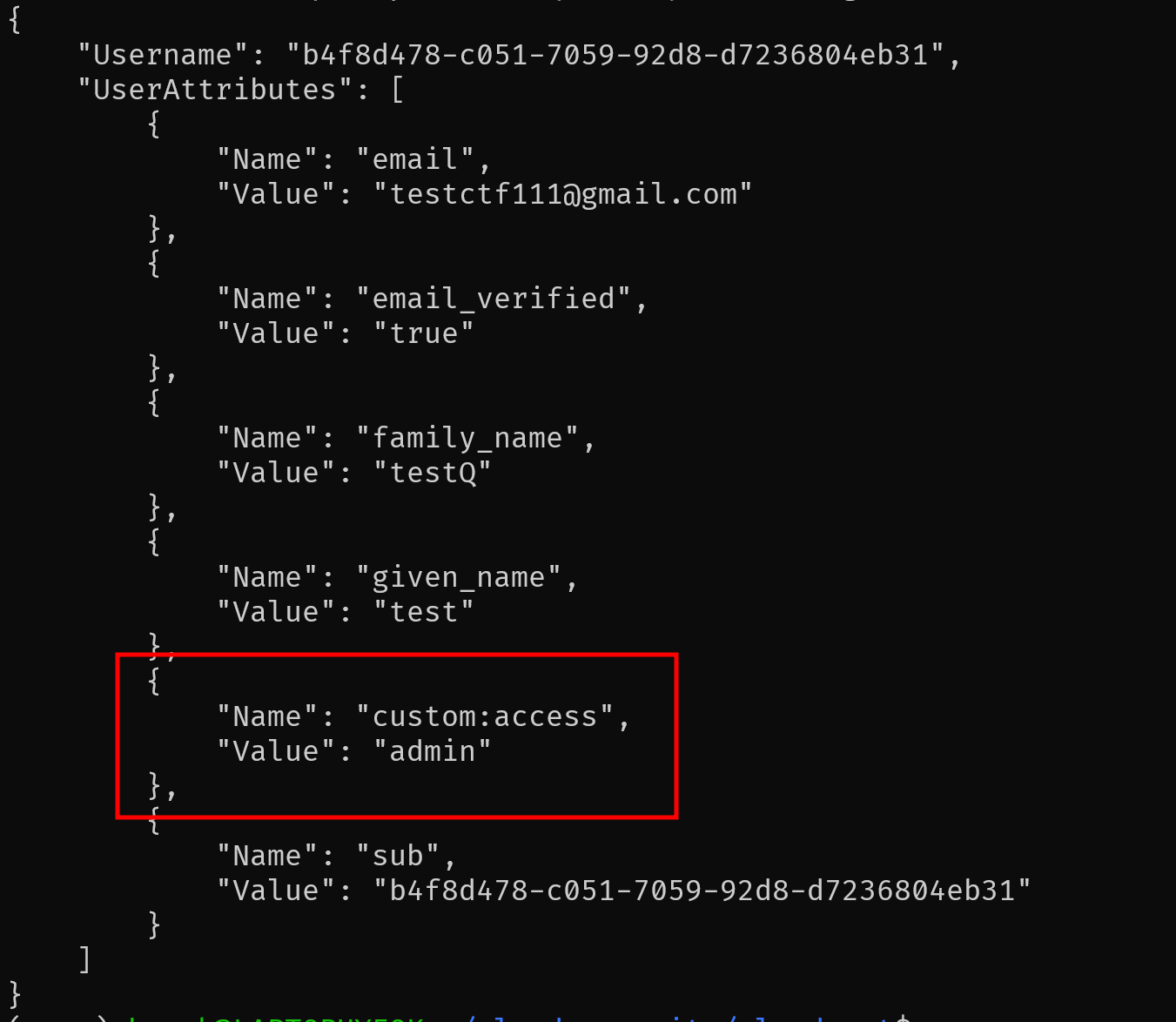 user 정보를 보면 userAttribute에 custom:으로 시작하는 custom attribute가 존재하는 것을 볼 수 있다.