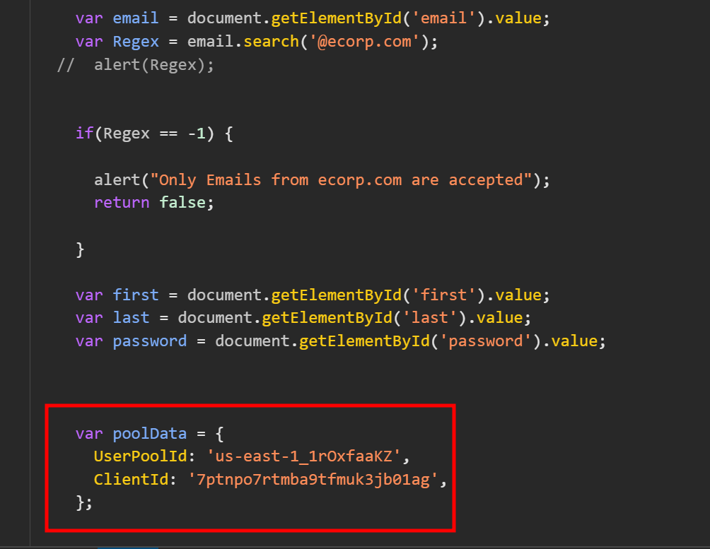 해당 Script 내에 Cognito의 UserPoolID와 ClientID가 평문으로 작성되어 있다.