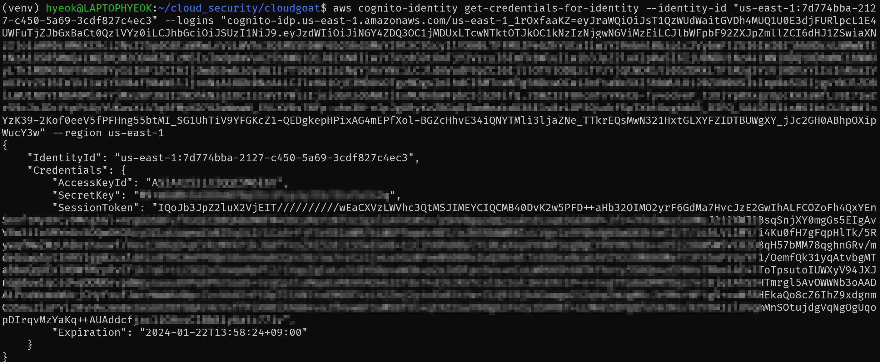 이 항목들을 바탕으로 최종적으로 Identity Pool Credential을 획득한다. (region 설정을 까먹지 말자)