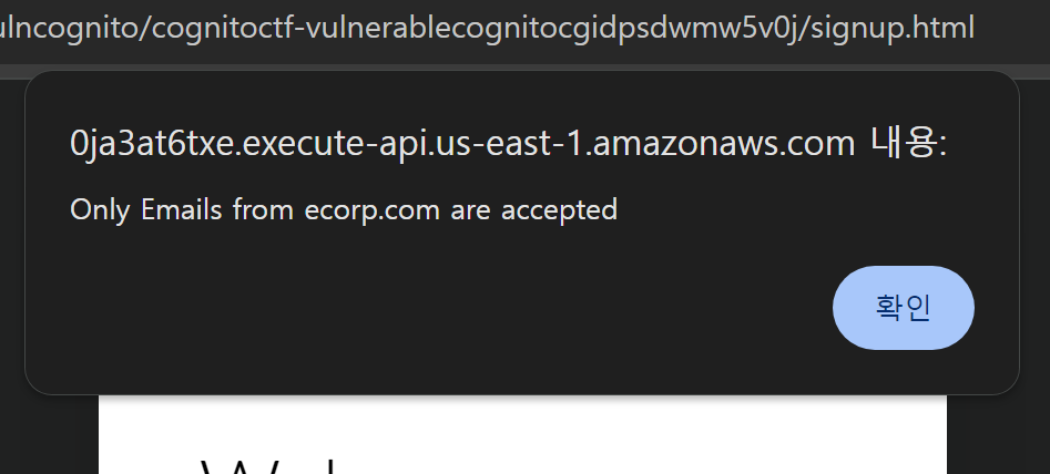 로그인과 회원가입 기능을 제공하는 Cognito임을 확인할 수 있다. 회원가입을 하려고 하면 email 검증에 막혀 특정 이메일 주소 이외에는 가입할 수 없이 막혀있는 것을 볼 수 있다.