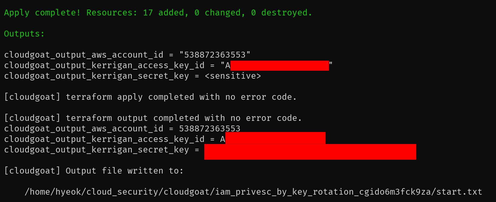 solutions 디렉토리 내의 iam_privesc_by_key_rotation 시나리오 제작 Terraform이 실행된다.