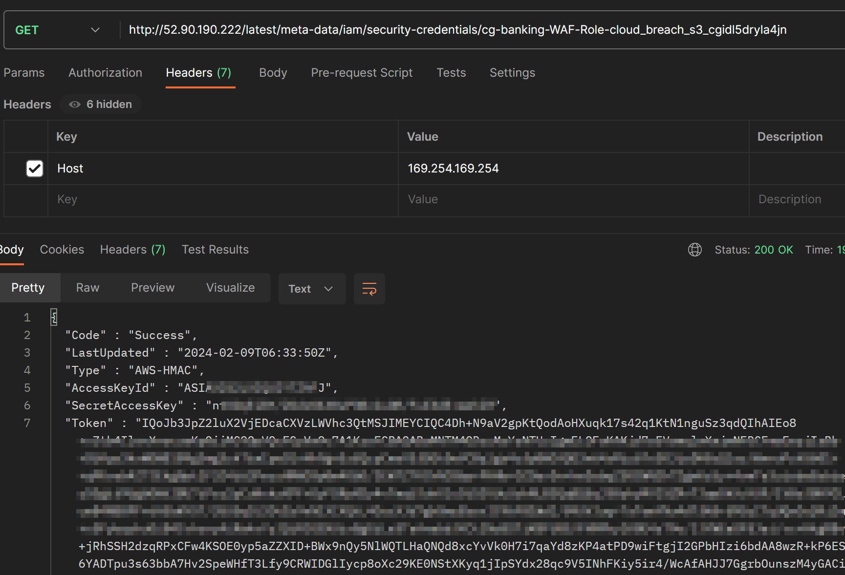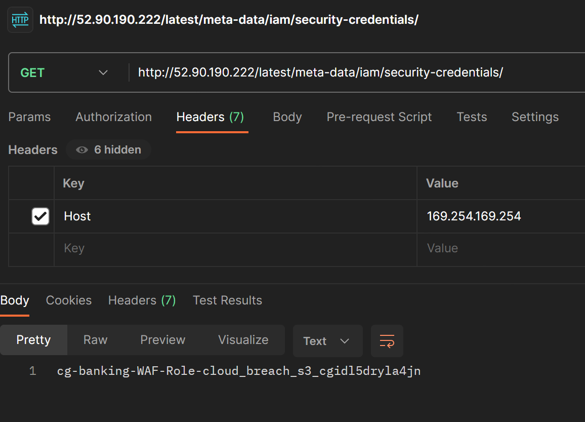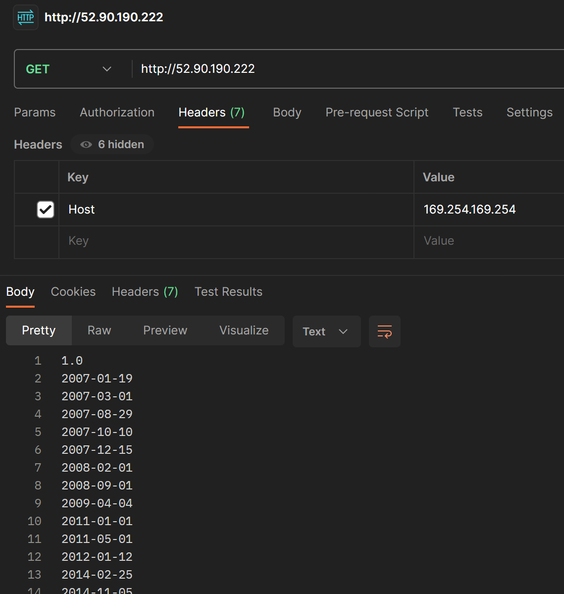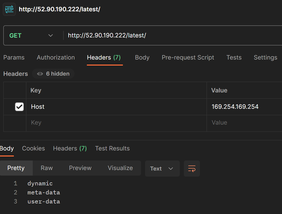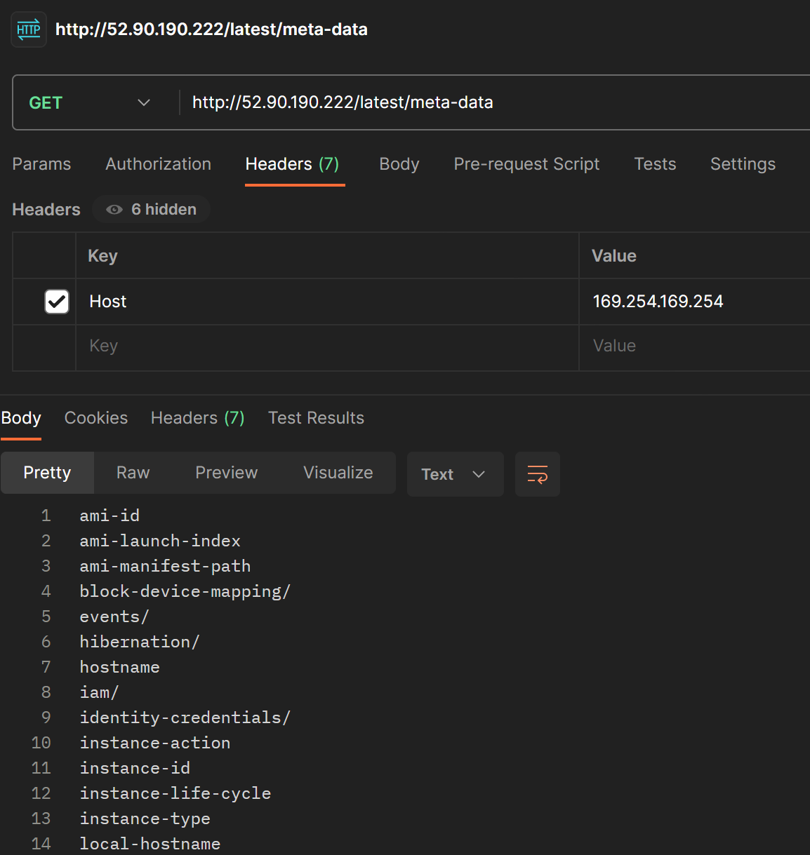 Host 헤더를 EC2 메타데이터 서버인 169.254.169.254로 설정하고 Request를 전송해본다.