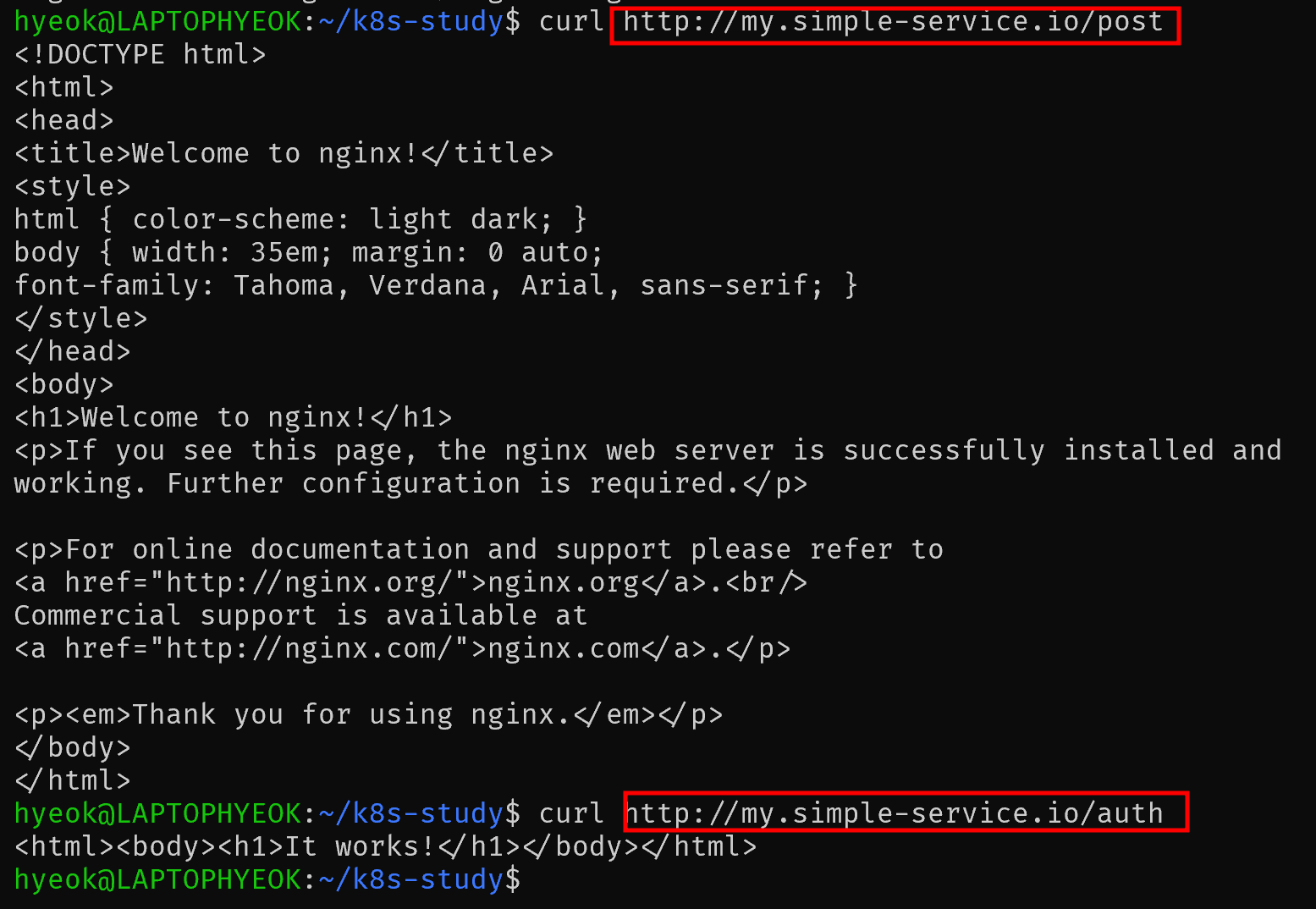 Ubuntu 환경에서 hosts 파일을 수정한 뒤, 해당 도메인으로 요청을 전송하면 아래와 같이 각 path별로 매핑시켜준 Ingress Rule에 따라 서비스로 연결되는 것을 볼 수 있다.