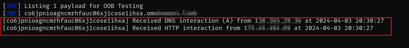 이후 Interactsh 서버쪽으로 DNS Query와 HTTP Response가 기록되는 것을 확인할 수 있다.