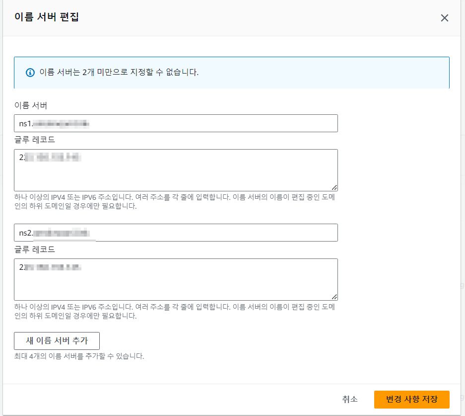등록된 도메인 > 이름서버 편집에서 NS 레코드에 적어주었던 2개의 서브도메인을 입력해준다. 서브도메인을 입력하면 하단에 글루 레코드 입력박스가 나타난다.
