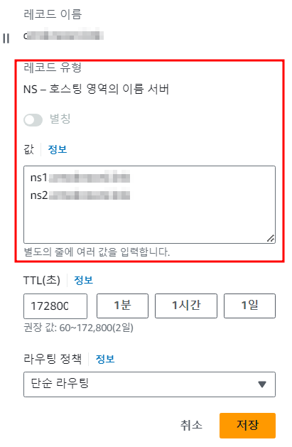 다음으로 NS 레코드 값을 다음과 같이 ns1, ns2 형식으로 수정해준다.