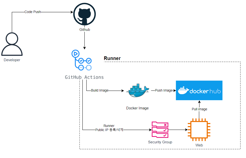 Github Actions를 실행하는 Runner는 호스팅된 가상머신이다. 다만, 이 Runner의 IP는 고정되어있지 않고 실행마다 계속 변경되는 부분이라 Runner가 EC2에 접근하기 위한 설정을 해주어야 한다. 배포되는 EC2가 보안그룹으로 관리되고 있다는 가정하에 파이프라인을 작성해보도록 한다.