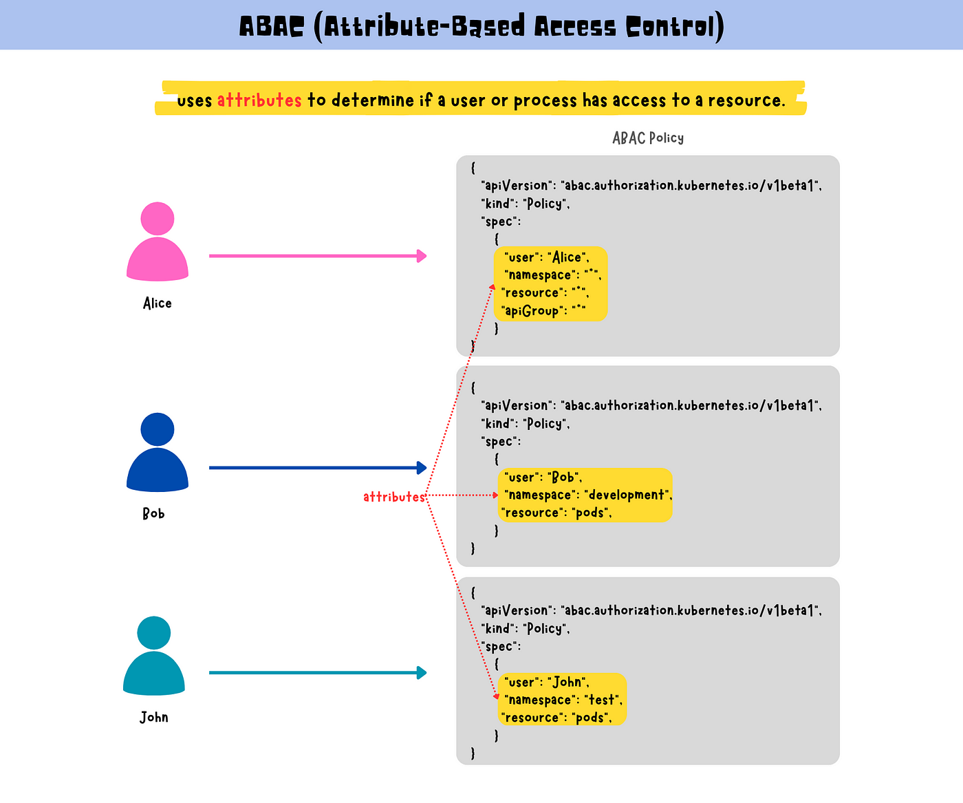 ABAC policy 파일의 구성은 다음과 같다. 아래 Policy는 user 'jane'이 default namespace의 pod를 읽을 수 있도록 하는 내용이다.