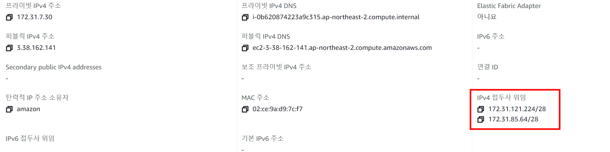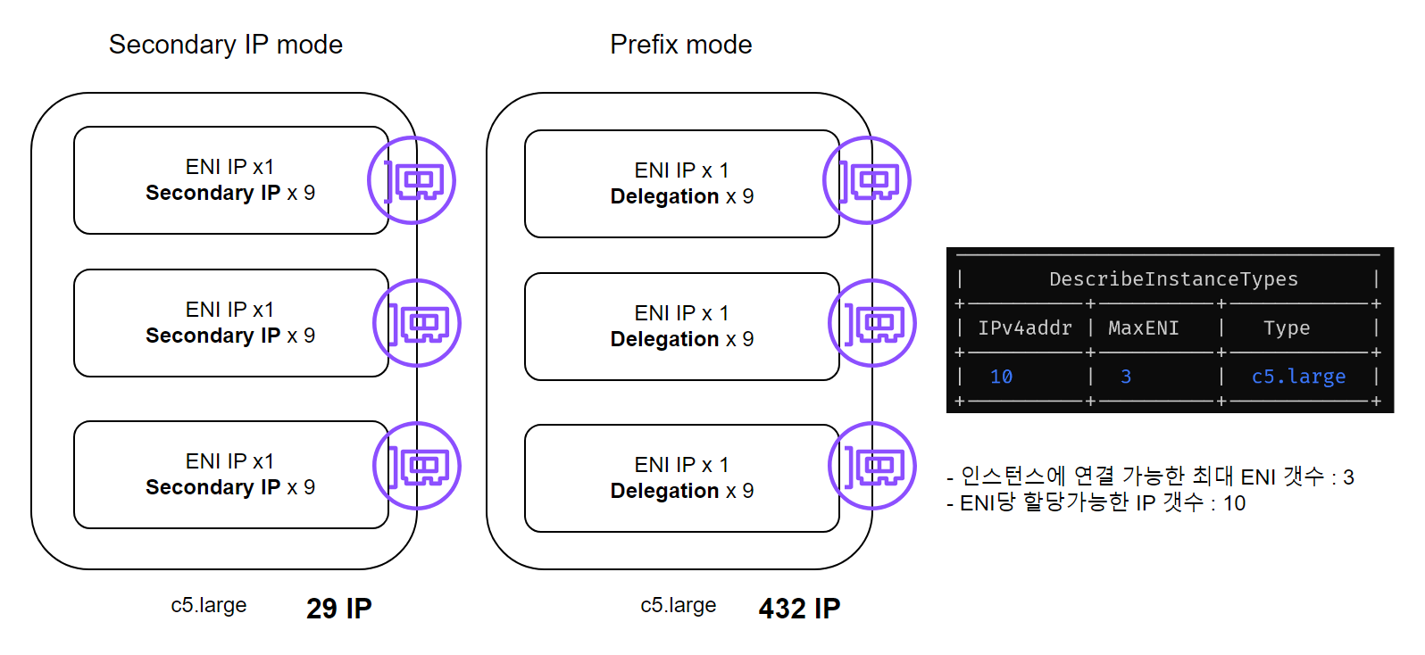 | node당 최대 IP수 | (ENI 갯수 * ( ENI 당 지원하는 IP 갯수 )) + 2 | (ENI 갯수 * (ENI 당 지원하는 IP 갯수)) * 16 (/28은 16개의 ip) |