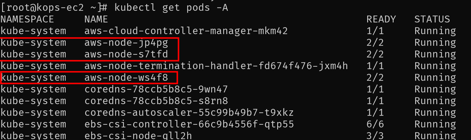 EKS는 기본적으로 VPC CNI를 사용하고, kOps로 클러스터를 만드는 경우 cluster 생성 시 networking 파라미터에 amazonvpc를 설정하면 VPC CNI를 사용한다.