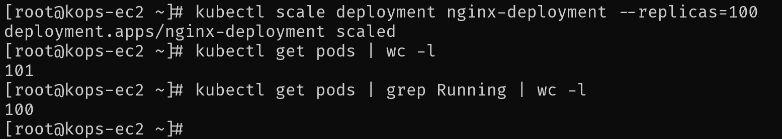 kOps 클러스터에서 Prefix mode로 전환 후, pod를 100개 배포하였을때에도 Pending되는 것 없이 모두 잘 배포됨을 볼 수 있다.