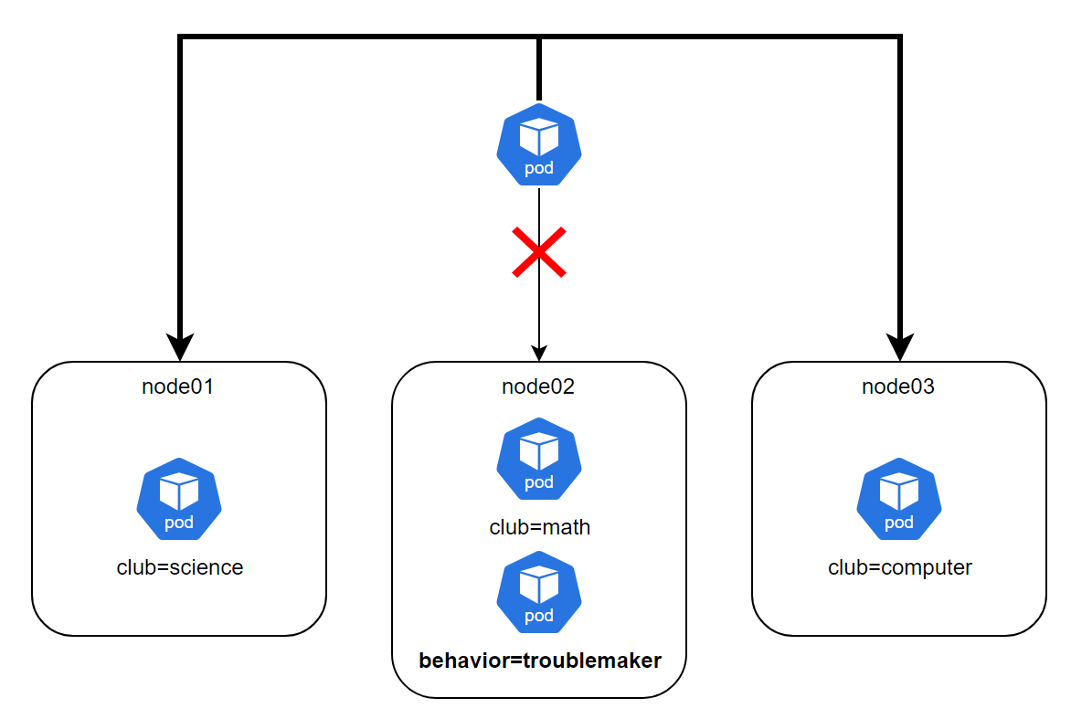 위의 Manifest에 따르면, 이 pod(학생)를 "behavior=troublemaker" 라벨을 가진 pod가 있는 node(hostname)에 배정하지 않는 것이다.