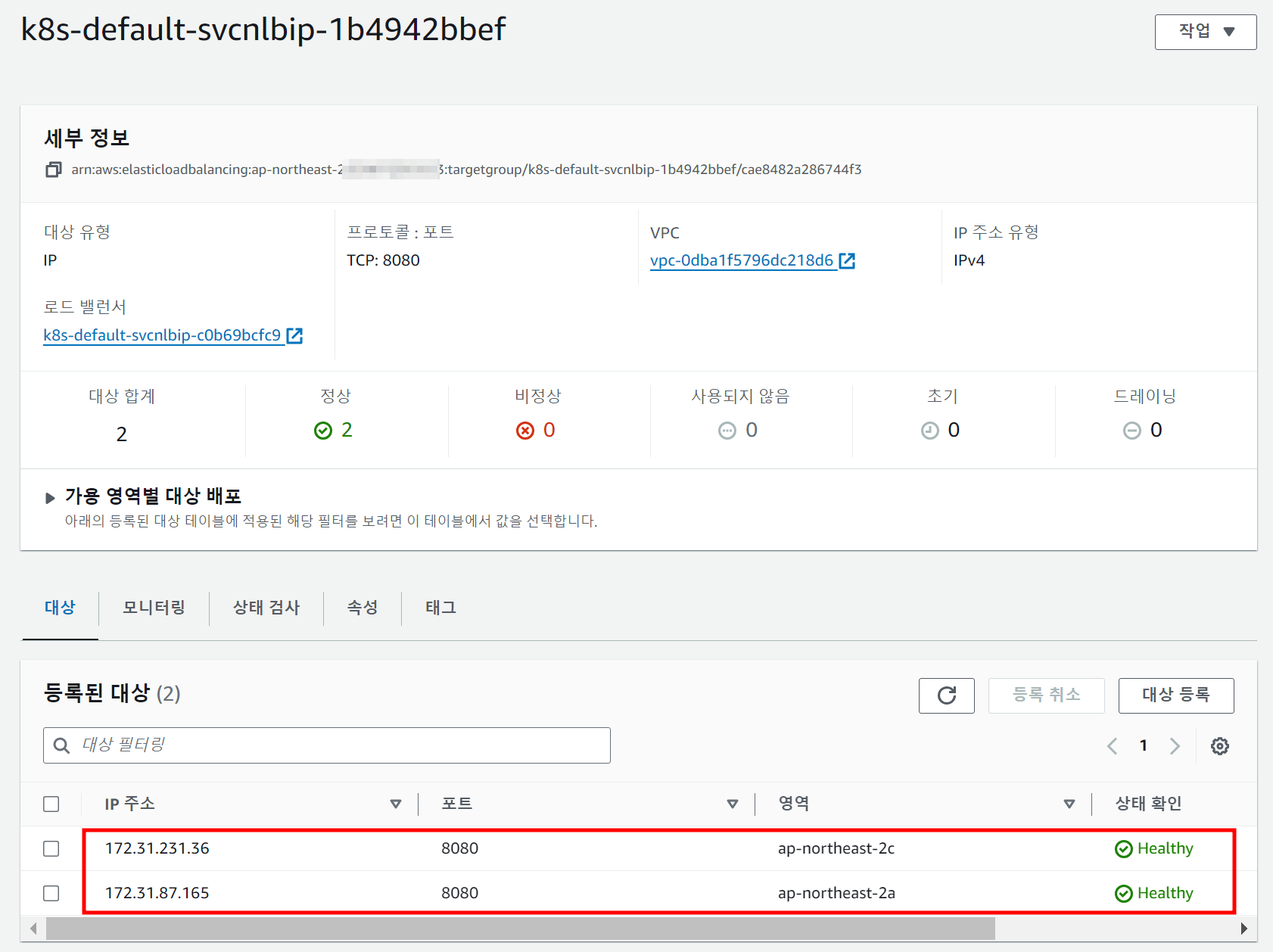 해당 Load Balancer에 연결된 Target Group(대상 그룹) 내용을 확인하면 2개의 IP를 볼 수 있다. 이들은 모두 pod의 IP이다. 이를 통해 Load Balancer Controller를 통해 내부 pod의 IP정보가 Load Balancer로 전달/관리가 되는 것을 알 수 있다.