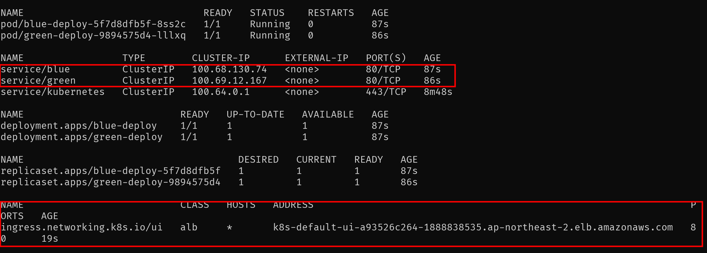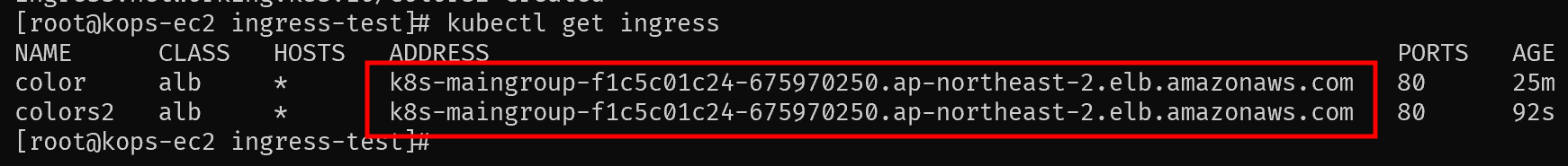 2개의 ingress를 배포한 뒤 내용을 확인하면 모두 같은 Address를 부여받은 것을 확인할 수 있다.