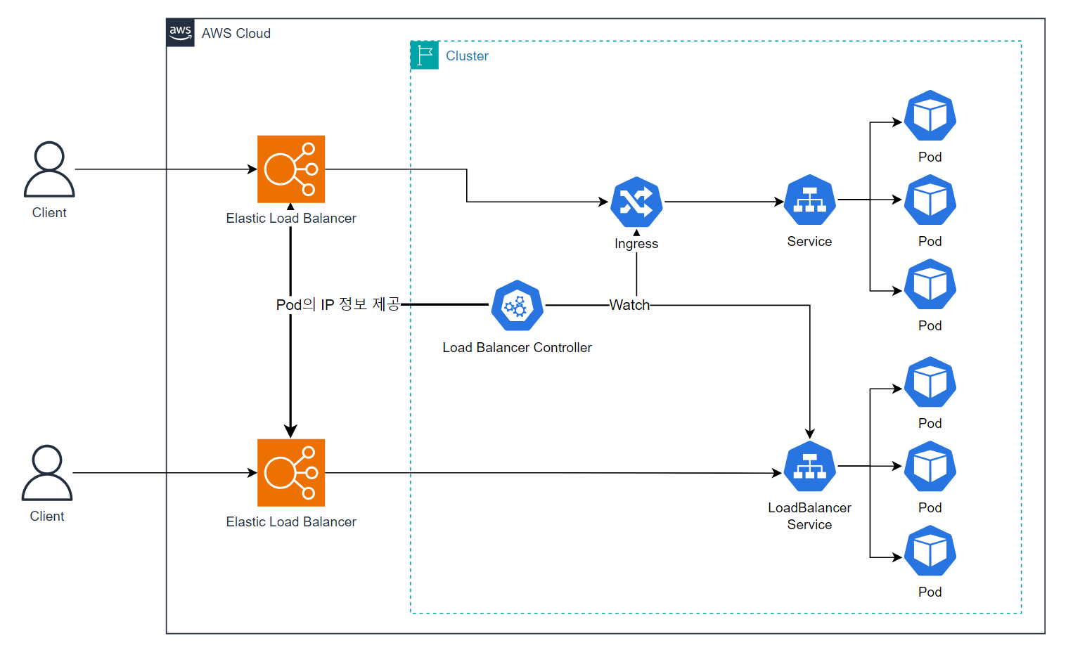 LoadBalancer와 Ingress 서비스는 AWS 클라우드 환경에 배포하는 경우 각각 NLB, ALB와 연동이 된다.