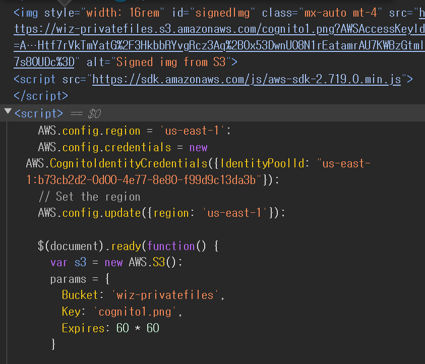 문제에 주어진 이미지 부분을 확인하면, cognito 관련 script를 발견할 수 있다.