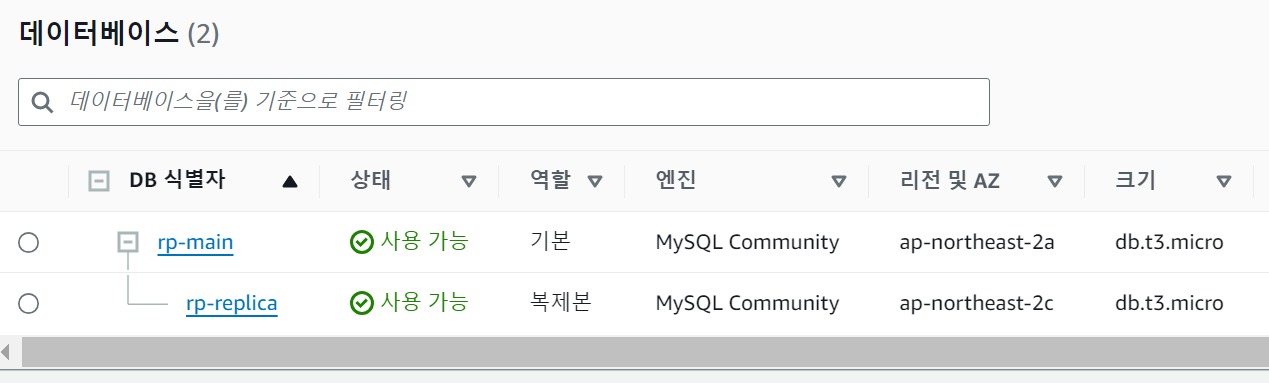 RDS DB목록을 확인하면 아래와 같이 2개가 Master와 복제본으로 구성이 된 것을 볼 수 있다. 그리고 각각의 엔드포인트 DNS 주소도 내용이 다른 것도 볼 수 있다.