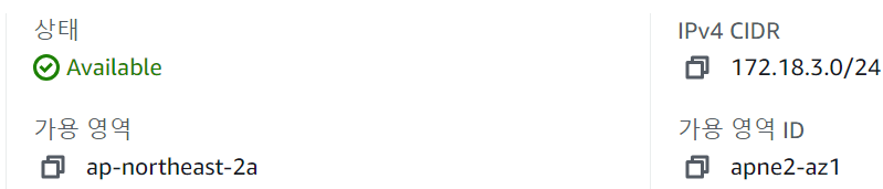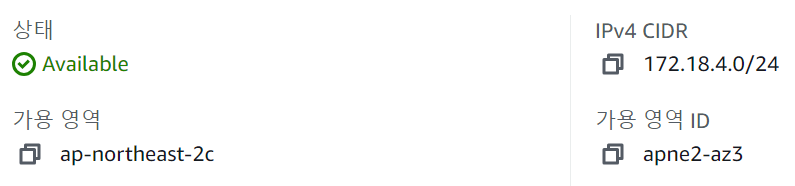 172.18.3.0/24는 ap-northeast-2a, 172.18.4.0/24는 ap-northeast-2c로 구성됨을 확인할 수 있다.