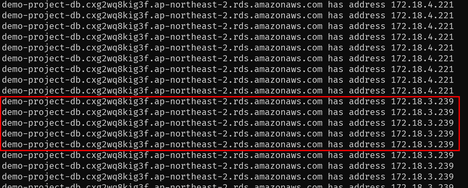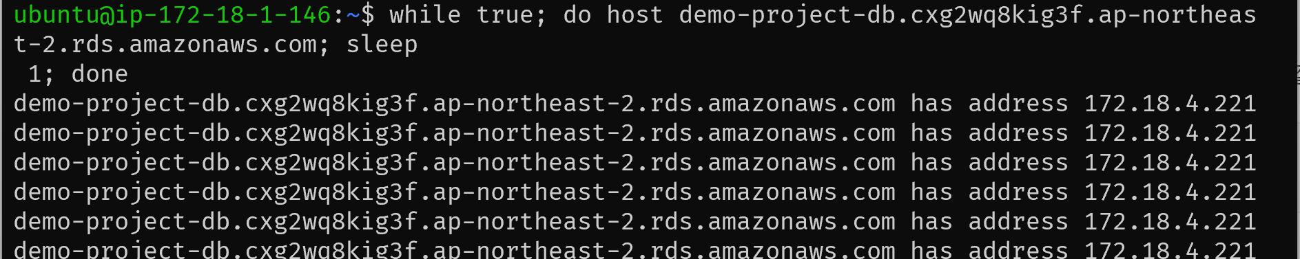 while true; do host [RDS 엔드포인트 DNS]; sleep 1; done