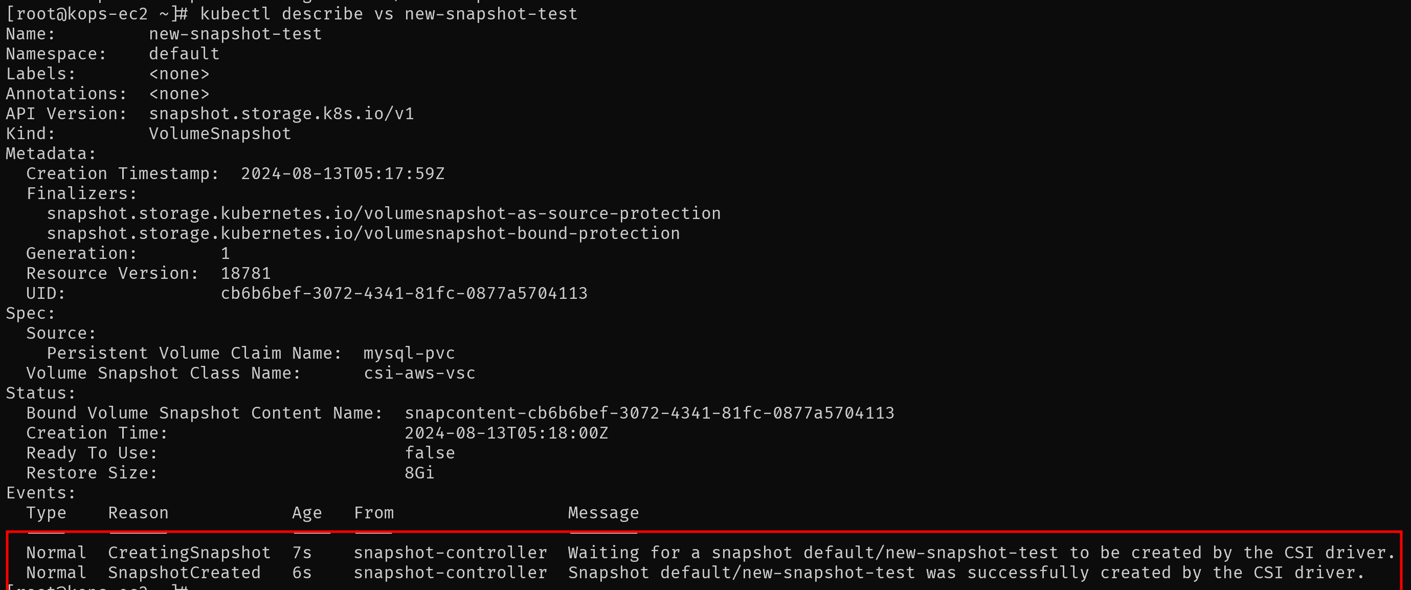 VolumeSnapshot을 생성하면 EBS 볼륨의 스냅샷이 생성되며, 약간의 대기 후에 스냅샷을 사용할 수 있는 상태가 된다.