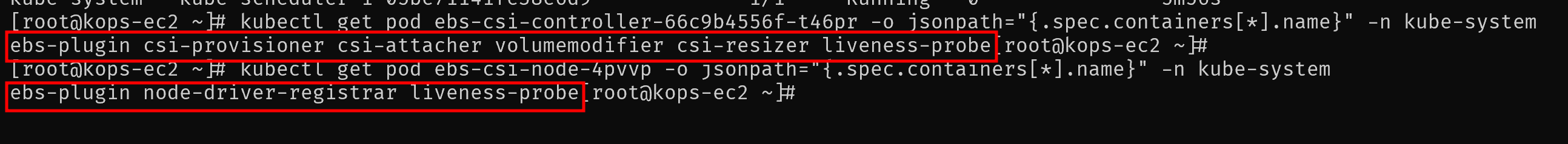kOps를 통해 클러스터를 생성하면 csi-controller와 csi-node가 별도의 add-on없이 자동으로 설치되며, EBS를 사용하기 위한 kops-csi-1-21이라는 이름의 StorageClass 객체도 동시에 생성된다.