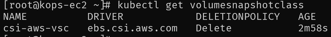 다음으로 VolumeSnapshotClass를 클러스터에 구축 후, EBS PVC를 백업할 VolumeSnapshot을 생성한다.