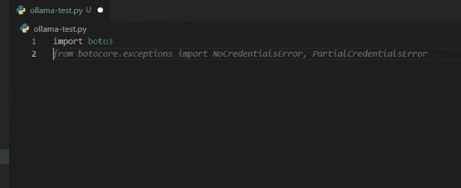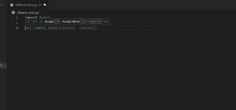 작성 중인 코드 뒤로 추천되는 코드를 볼 수 있다. `tab`으로 자동완성할 수 있다. Codewhisperer에서 방향키로 다른 추천 code를 볼 수 있었지만, 아쉽게도 여기에서는 지원하지 않는다.