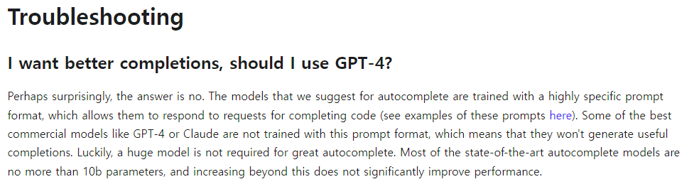 Continue에서는 3가지 작업 모두 chatGPT나 Claude같은 범용적 모델을 연결하는 것이 아닌, 각 작업에 적합한 모델을 연결할 것을 권장한다.