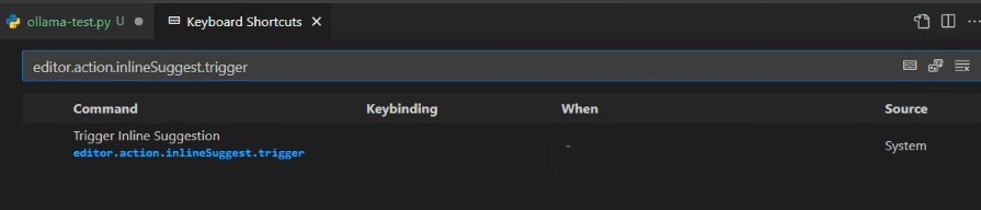 autocomplete는 기본적으로 트리거 키가 설정되어있지 않다. Keyboard Shortcuts에 `editor.action.inlineSuggest.trigger`에 키를 지정해주어서 키 입력으로 autocomplete를 트리거시킬 수 있다.