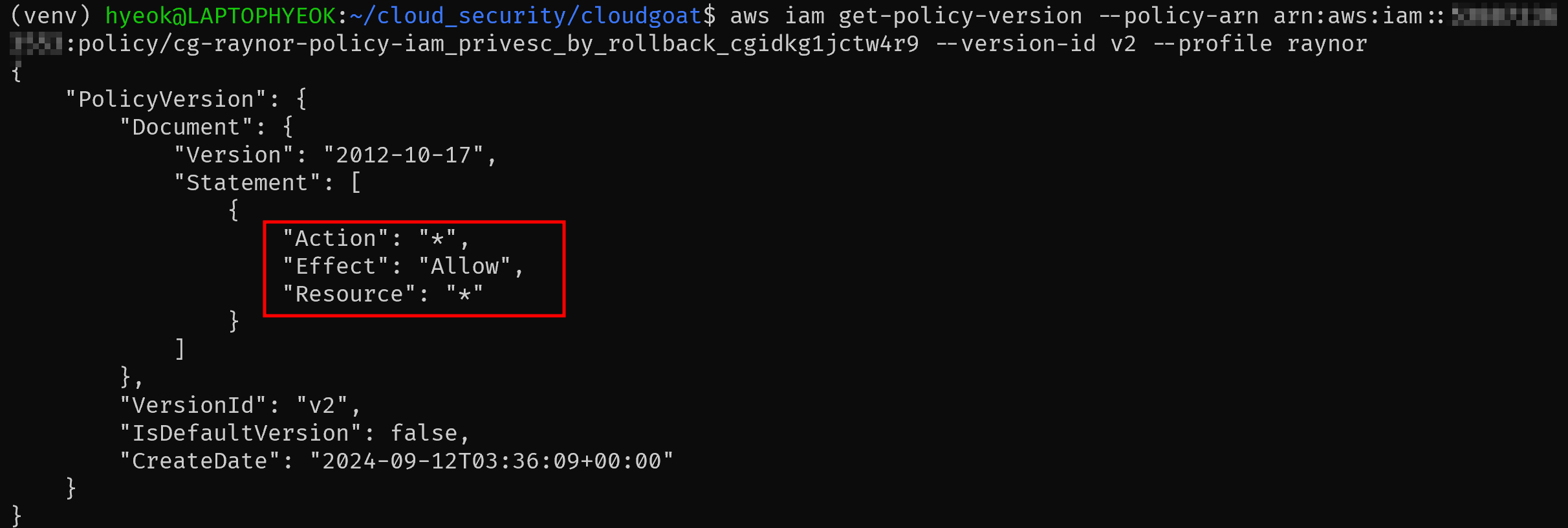 aws iam get-policy-version --policy-arn [policy ARN] --version-id [버전 ID] --profile raynor