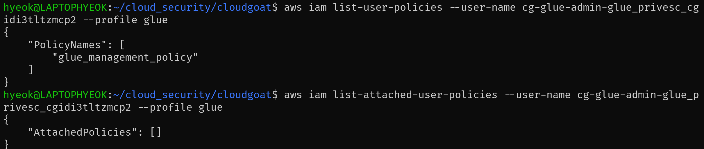 aws iam list-user-policies --user-name [user명] --profile glue