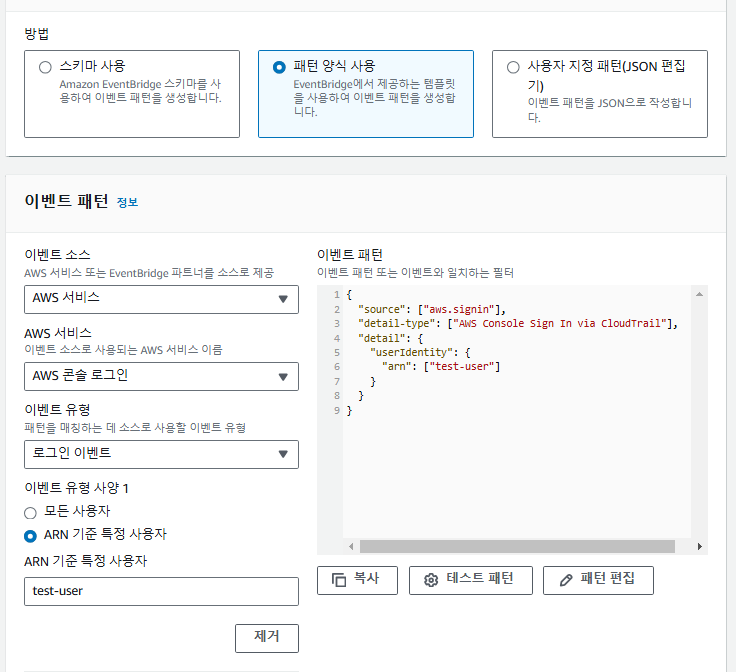 한가지 예시로, 아래와 같은 패턴은 test-bucket이라는 이름의 버킷에 object가 생성되는 경우의 이벤트 패턴이다.