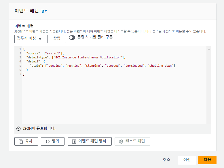 이벤트 패턴은 위와 같은 이벤트를 가져와야 하기에 "aws.ec2"를 source로, "detail-type"을 "EC2 Instance State-change Notification"으로 작성한다.