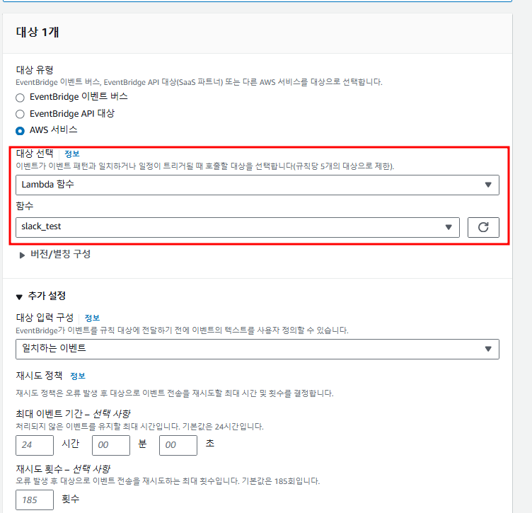 하단 '추가 설정'의 '대상 입력 구성'은 [Rule의 소스를 통해 Eventbridge로 넘어온 이벤트의 내용을 어떻게 Target으로 전송해줄 것인가]에 대한 설정이다.