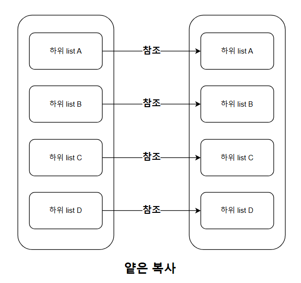 이중 list와 같은 구조에서는 최상위 객체에 대해서만 새롭게 복사하지만, 하위 객체인 내부 list에 대해서는 원본을 참조하는 것이라고 볼 수 있다.