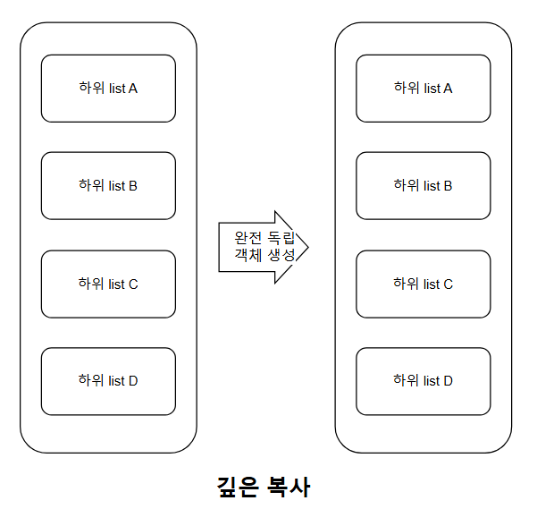 깊은 복사는 원본과 완전히 독립된 객체를 생성하기에, 복사본이나 원본의 변경에도 반대의 것에는 영향을 주지 않는다.