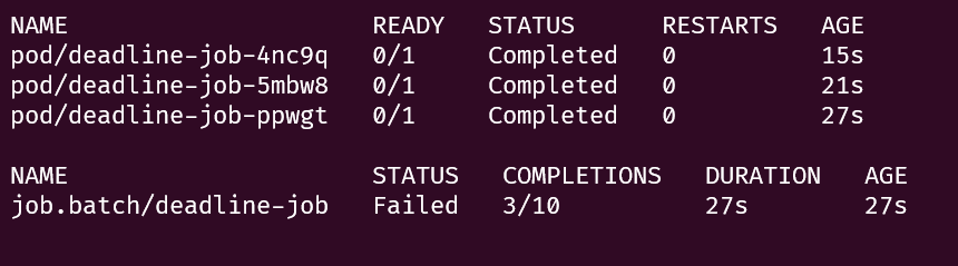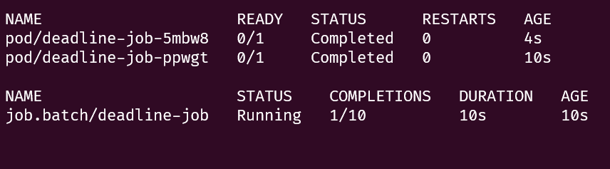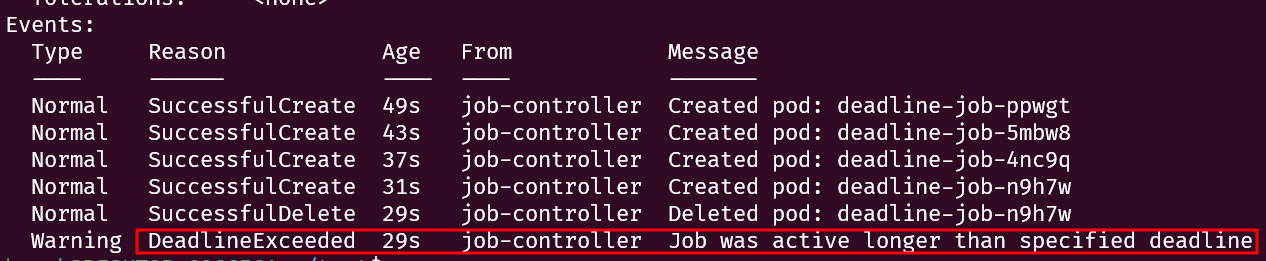 이렇게 Deadline을 넘어서 중단된 Job의 실행중이던 파드는 Terminate되어 삭제되는 것도 볼 수 있다.