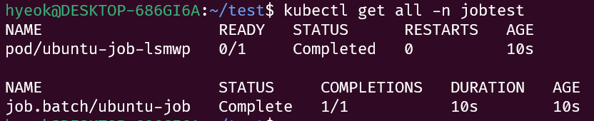 Job은 성공적으로 수행되어 종료되면 'Completed' 상태로 전환된다. 이는 작업이 완전종료되었다는 의미로, 해당 파드는 더이상 실행되지 않는 상태가 된다.