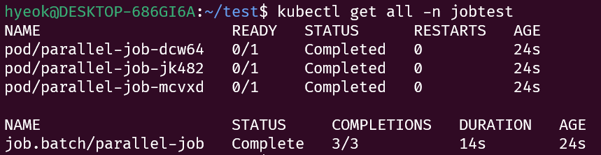 이 Job을 실행하면 3개의 pod가 실행되고, 모두 Completed 되어 Job이 성공적으로 완료된 것을 볼 수 있다.