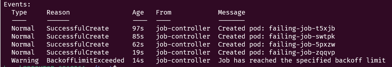 job의 describe를 확인하면, 3번까지 재시도한 이벤트와 함께 결국 job이 backoffLimit에 의해 중단된 내용을 확인할 수 있다.