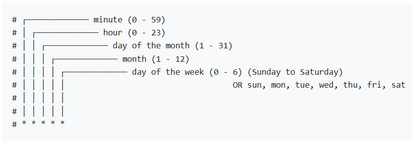 CronJob에서 지원하는 Cron 표현식은 아래와 같이 5개의 필드로 나뉜다.
