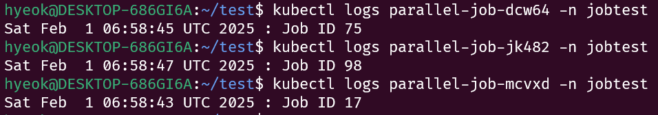 그리고 실행된 Job의 각 pod 로그를 확인하면 job의 pod가 모두 병렬로 실행된 내역을 확인할 수 있다.