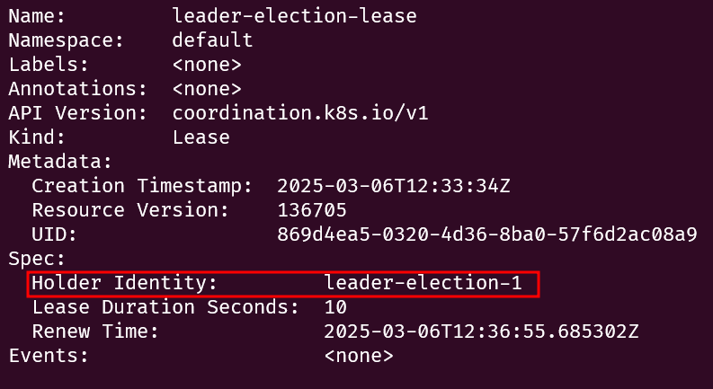 pod를 구동한 뒤, 앞서 생성한 lease를 확인하면 holderIdentity가 지정된 것을 볼 수 있다.