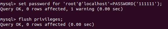 mysql> set password for 'root'@'localhost'=PASSWORD('비밀번호');