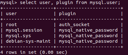 mysql> select user, plugin from mysql.user;
