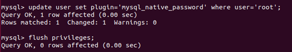 mysql> update user set plugin='mysql_native_password' where user='root';