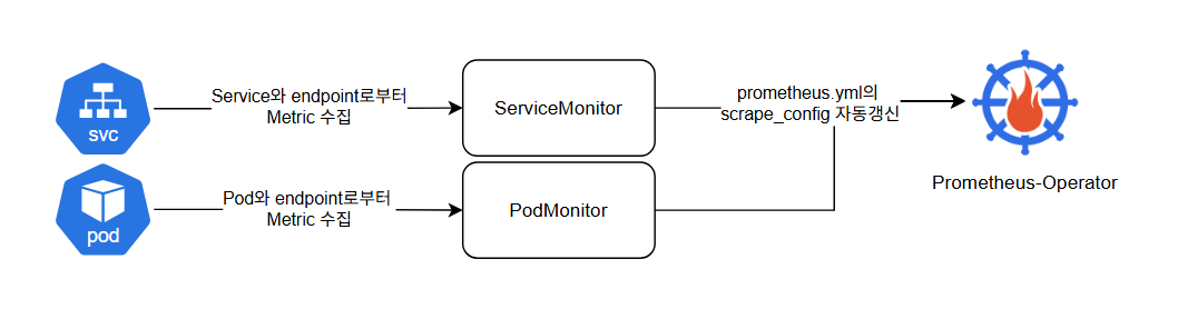 ServiceMonitor는 이름에 맞게 'Service'를 스크래핑 대상으로 설정하고, PodMonitor는 파드를 대상으로 지정한다.