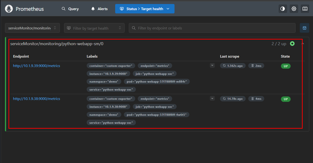 Prometheus에서 ServiceMonitor 객체를 통해, 재시작되지 않고 Job이 바로 추가되는 것을 볼 수 있다.