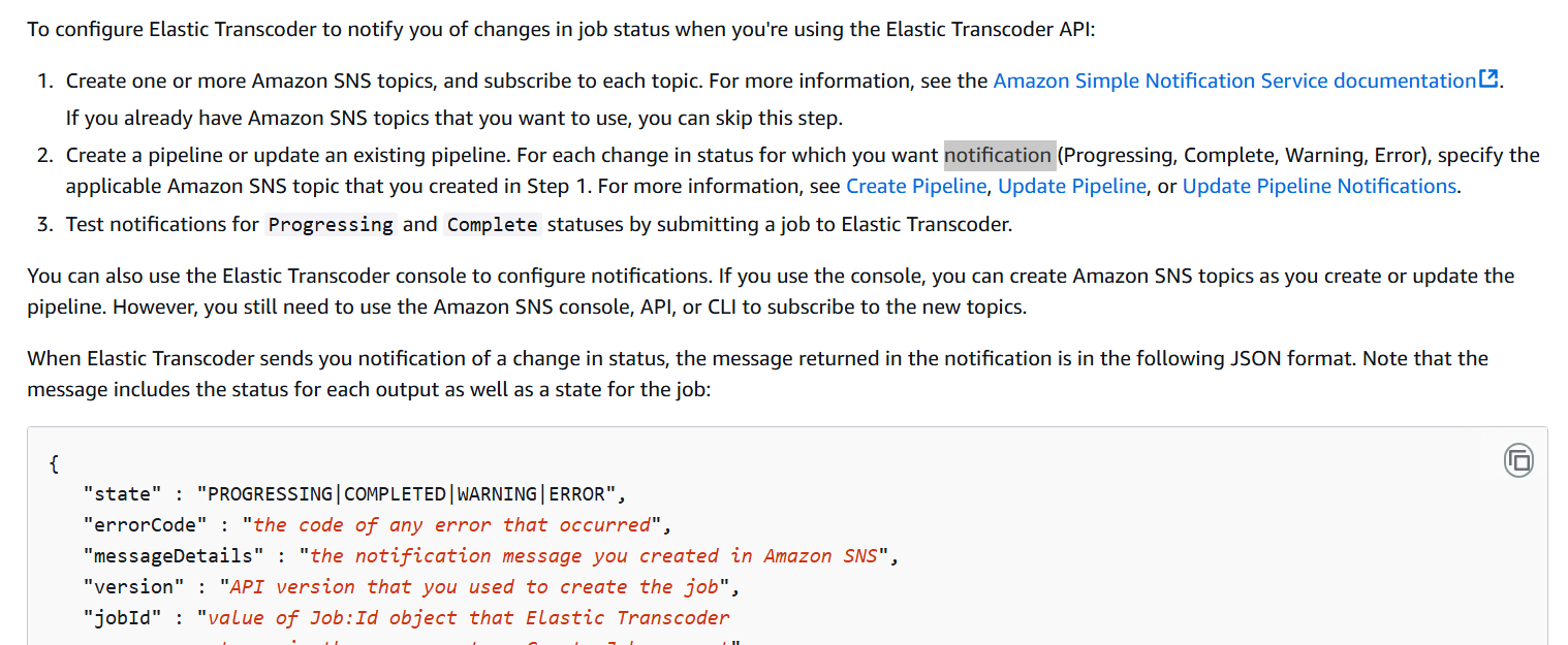 Elastic Transcoder에서 Job을 생성할때에는 Job을 담는 Pipeline에 SNS Topic을 지정해서 작업이 완료되면 Topic으로 메시지를 전달해주는 구조였다.