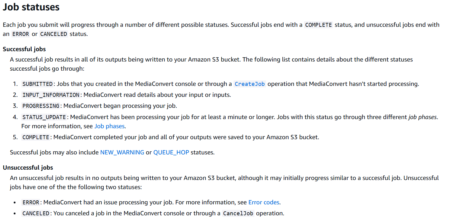 mediaconvert의 job과 관련된 API의 자세한 파라미터들은 아래 첨부된 Docs를 참고한다. (스압 주의)